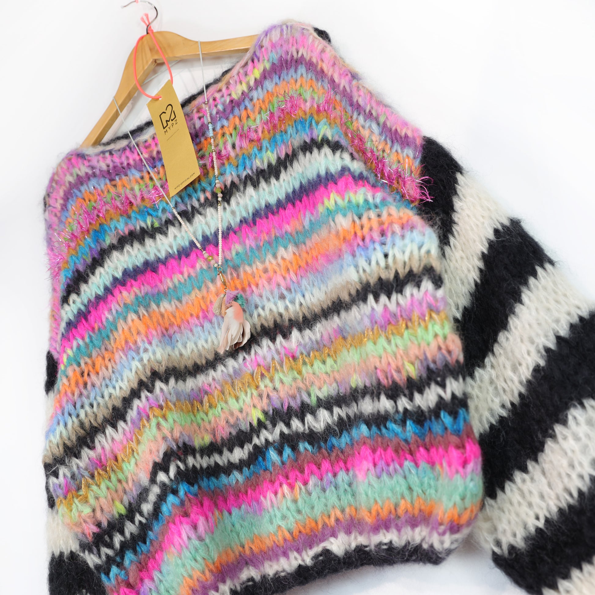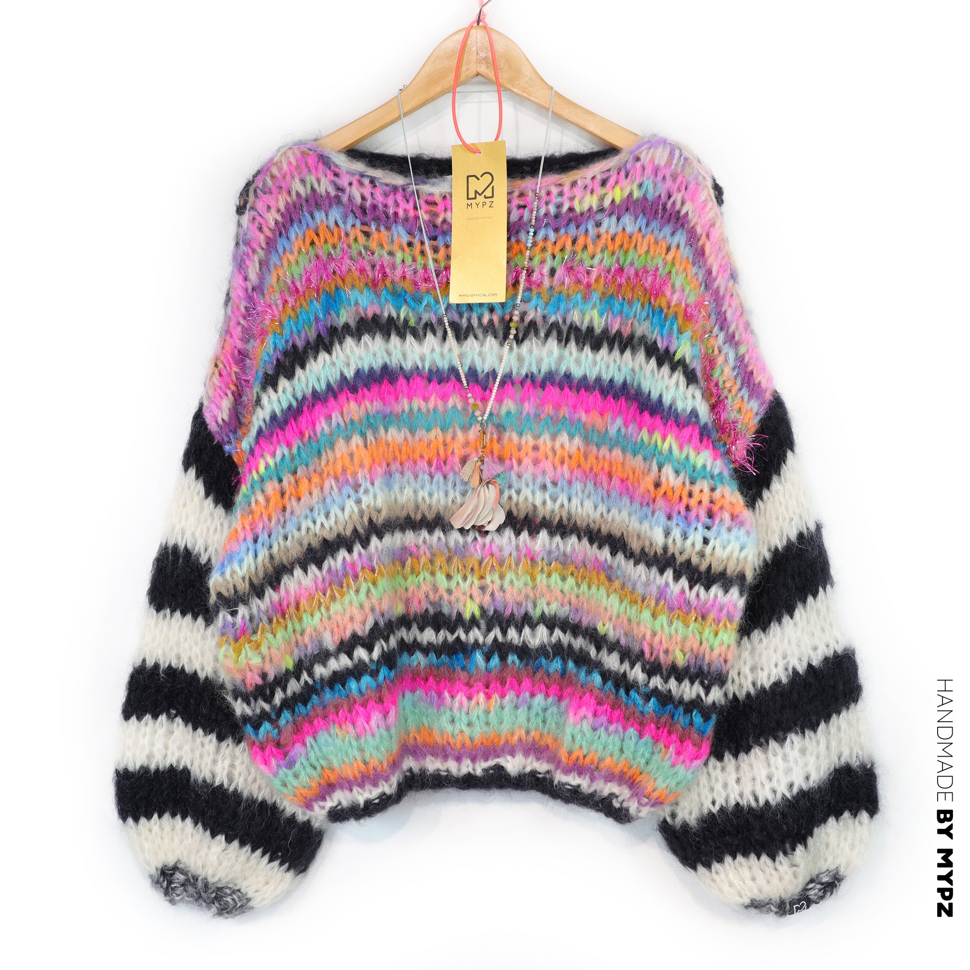 This is a handmade knit made by MYPZ in The Netherlands. Each cardigan or sweater is a unique piece and we take a lot of time and care to create these beautiful products. This beautiful sweater is made of a high quality mohair and does not pill. It is very light, warm and comfortable. These brushed yarns may shed a little but after a while, this will subside.