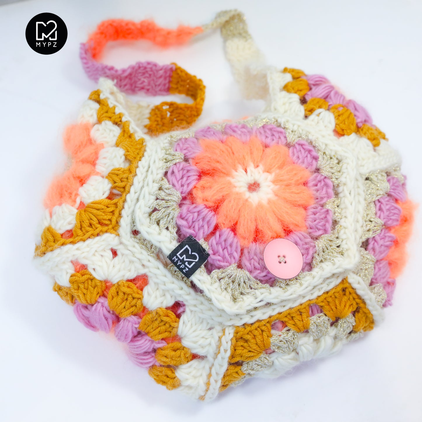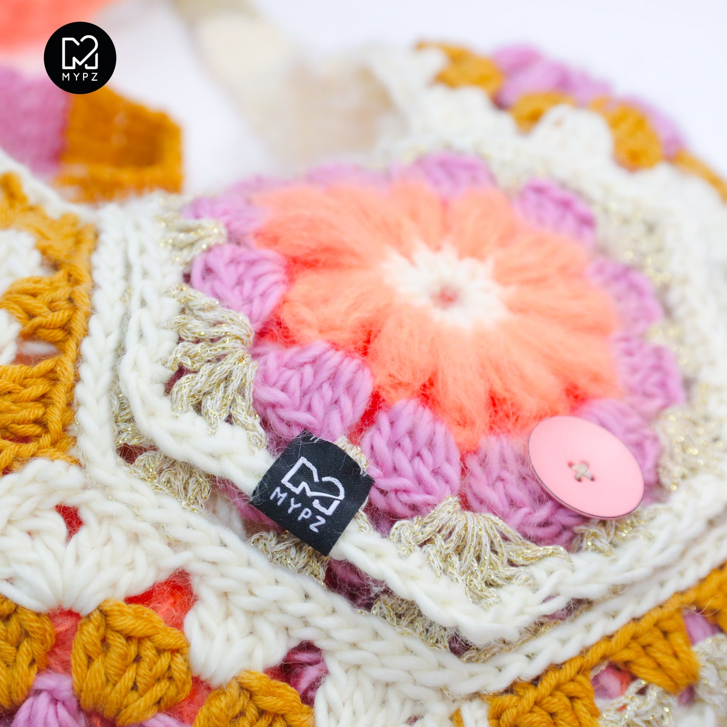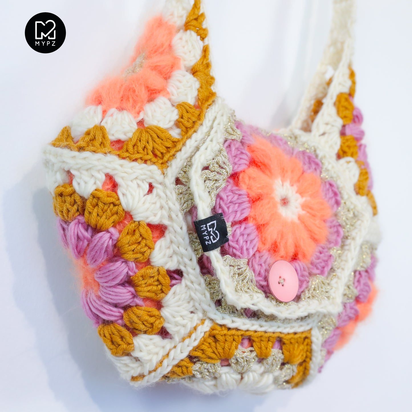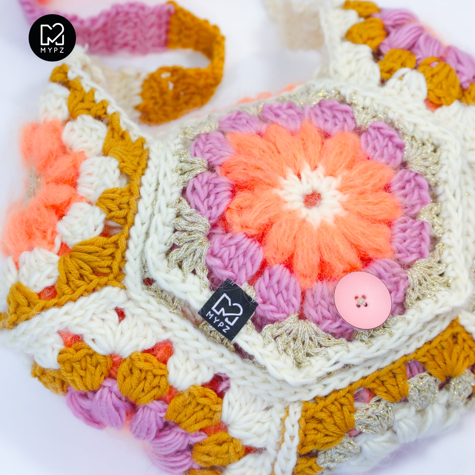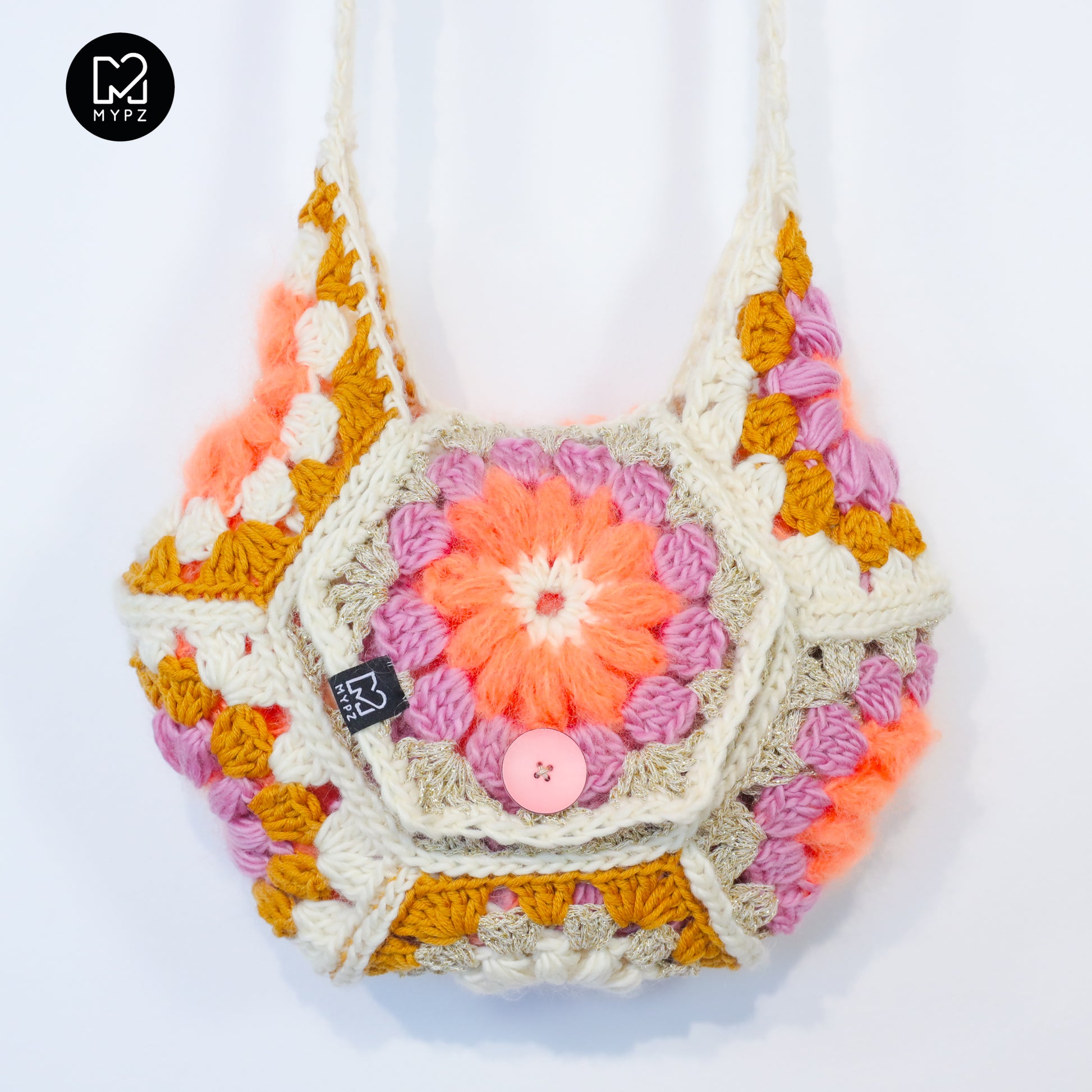 You crochet this bag with different yarns: MYPZ Super Soft Merino DK, Mypz Chunky kidmoahir DK, Mypz Dream wool and durable Glam Gold.