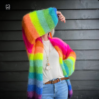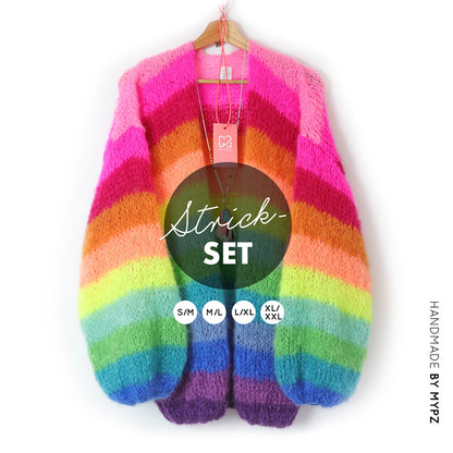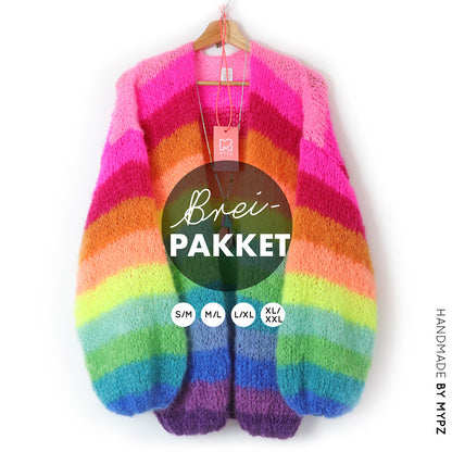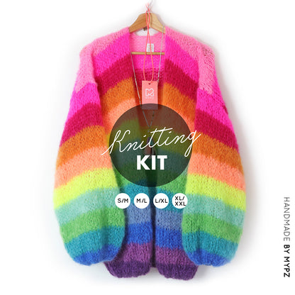 This light mohair cardigan in all the colors of the rainbow is a pleasure to wear because it is warm and very light. The entire pattern is supported with a line drawing which shows the number of stitches. Refer to the line drawing at all steps. This kit contents 13 balls of MYPZ chunky kidmohair DK, that's enough for all sizes.